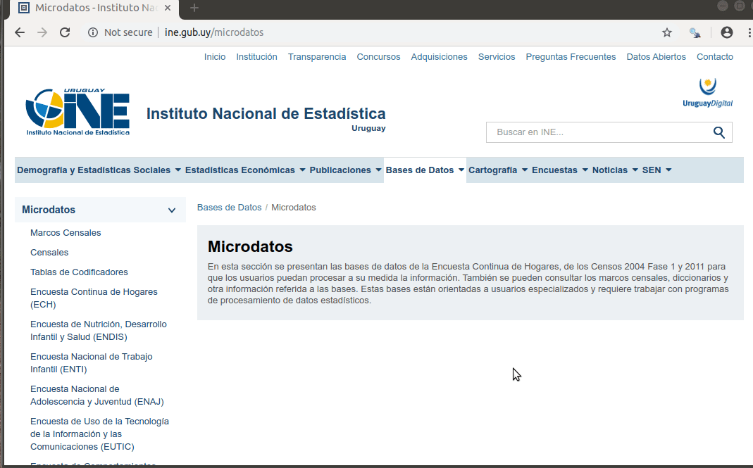 Características - La Encuesta Continua de Hogares (ECH), releva información de los <span style=" font-weight: bold; border-radius: 4px; padding-right: 4px; padding-left: 4px; background-color: #b3e2cd !important;" >hogares particulares</span> uruguayos, realizada anualmente por el Instituto Nacional de Estadística (INE). <br> -- - Un hogar particular "es la persona o grupo de personas que habitan bajo un <span style=" font-weight: bold; border-radius: 4px; padding-right: 4px; padding-left: 4px; background-color: #b3e2cd !important;" >mismo techo</span> y que al menos para su alimentación, dependen de un <span style=" font-weight: bold; border-radius: 4px; padding-right: 4px; padding-left: 4px; background-color: #b3e2cd !important;" >fondo común</span>" ([Metodología ENHA 2006](http://www.ine.gub.uy/documents/10181/36026/metodologia+enha+2006.pdf/89bcaa25-5099-46a7-bc1e-9f577c92b21e)). <br> -- - Se debe definir una persona <span style=" font-weight: bold; border-radius: 4px; padding-right: 4px; padding-left: 4px; background-color: #b3e2cd !important;" >jefa de hogar</span> la que se tomará como referencia para determinar la relación entre quienes integran el hogar. <br><br> -- - Los objetivos son obtener <span style=" font-weight: bold; border-radius: 4px; padding-right: 4px; padding-left: 4px; background-color: #b3e2cd !important;" >indicadores</span> para monitorear la evolución del <span style=" font-weight: bold; border-radius: 4px; padding-right: 4px; padding-left: 4px; background-color: #b3e2cd !important;" >mercado de trabajo</span>, el <span style=" font-weight: bold; border-radius: 4px; padding-right: 4px; padding-left: 4px; background-color: #b3e2cd !important;" >ingreso</span> de los hogares y las condiciones de vida de la población. <br> -- - Los microdatos se obtienen desde la [web del INE](http://ine.gub.uy/web/guest/encuesta-continua-de-hogares1) --- # Dimensiones - La ECH releva información referente a la vivienda, el hogar y las personas: - Características de la <span style=" font-weight: bold; border-radius: 4px; padding-right: 4px; padding-left: 4px; background-color: #b3e2cd !important;" >vivienda</span> - Tenencia - Materiales de construcción, etc. - Características del <span style=" font-weight: bold; border-radius: 4px; padding-right: 4px; padding-left: 4px; background-color: #b3e2cd !important;" >hogar</span> - Cantidad de personas - Relaciones de parentesco, etc. - Características de las <span style=" font-weight: bold; border-radius: 4px; padding-right: 4px; padding-left: 4px; background-color: #b3e2cd !important;" >personas</span> que integran los hogares relevados - Situación ocupacional de las personas de 14 o más años - Ingresos - Educación, etc. --- class: inverse, center, middle # ech --- # Paquete ech - Es un paquete de R para <span style=" font-weight: bold; border-radius: 4px; padding-right: 4px; padding-left: 4px; background-color: #b3e2cd !important;" >facilitar el procesamiento</span>de la Encuesta Continua de Hogares. - En su versión actual admite trabajar con las ECH de <span style=" font-weight: bold; border-radius: 4px; padding-right: 4px; padding-left: 4px; background-color: #b3e2cd !important;" >2011 a 2019</span>. - Está pensado para trabajar con los <span style=" font-weight: bold; border-radius: 4px; padding-right: 4px; padding-left: 4px; background-color: #b3e2cd !important;" >microdatos fusionados</span> (hogares y personas). - Está en <span style=" font-weight: bold; border-radius: 4px; padding-right: 4px; padding-left: 4px; background-color: #b3e2cd !important;" >proceso de aceptación</span> en CRAN. Ahora disponible en [github](https://github.com/calcita/ech). - Lo desarrollo junto a [Richard Detomasi](https://github.com/RichDeto). <img src="https://raw.githubusercontent.com/calcita/ech/master/man/figures/ech_logo.png" width="110px" style="display: block; margin: auto;" /> --- # Historia y motivación de ech .left-column[ <img src="https://raw.githubusercontent.com/RichDeto/geouy/master/man/figures/geouy_logo_b.png" width="110px" style="display: block; margin: auto;" /> <img src="https://raw.githubusercontent.com/holatam/eph/master/man/figures/logo.png" width="110px" style="display: block; margin: auto;" /> <img src="https://camo.githubusercontent.com/09731059c02d852f557d90e2b2fd5ba8a3e97f03/68747470733a2f2f70616368616d616c746573652e6769746875622e696f2f636173656e2f68657869636f6e2e737667" width="110px" style="display: block; margin: auto;" /> ] .right-column[ - Una <span style=" font-weight: bold; border-radius: 4px; padding-right: 4px; padding-left: 4px; background-color: #b3e2cd !important;" >puerta de entrada</span> a R. - <span style=" font-weight: bold; border-radius: 4px; padding-right: 4px; padding-left: 4px; background-color: #b3e2cd !important;" >Democratizar</span> el uso de la ECH, brindando una herramienta libre y gratuita. - Fomentar la <span style=" font-weight: bold; border-radius: 4px; padding-right: 4px; padding-left: 4px; background-color: #b3e2cd !important;" >publicación de código</span>, no tan común por acá. - Al principio era rech y así lo presentamos en diferentes eventos de R. - Luego conocimos otros <span style=" font-weight: bold; border-radius: 4px; padding-right: 4px; padding-left: 4px; background-color: #b3e2cd !important;" >proyectos similares</span>: [eph](https://github.com/holatam/eph) (Argentina) y [casen](https://github.com/pachamaltese/casen) (Chile)... Cambiamos el nombre y quitamos la parte de visualización y Richard creó [geouy](https://github.com/RichDeto/geouy) ] --- # Ventajas de usar ech - Función para <span style=" font-weight: bold; border-radius: 4px; padding-right: 4px; padding-left: 4px; background-color: #b3e2cd !important;" >descargar los microdatos</span> desde la web del INE - Funciones para <span style=" font-weight: bold; border-radius: 4px; padding-right: 4px; padding-left: 4px; background-color: #b3e2cd !important;" >calcular variables</span>: mercado 